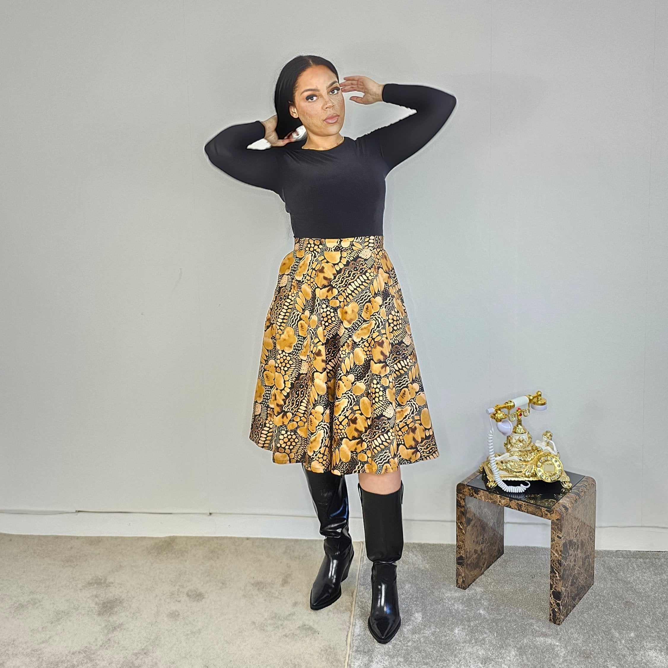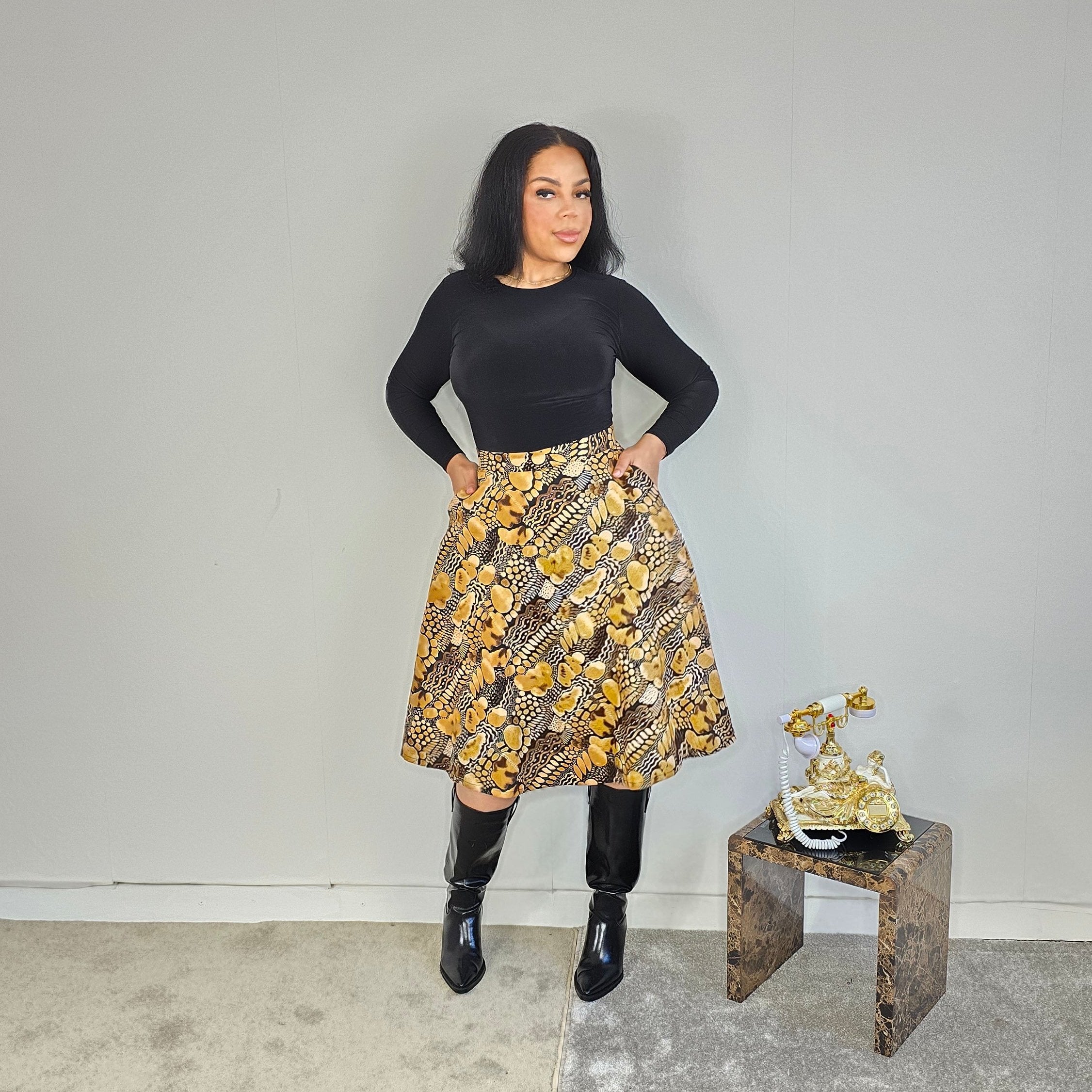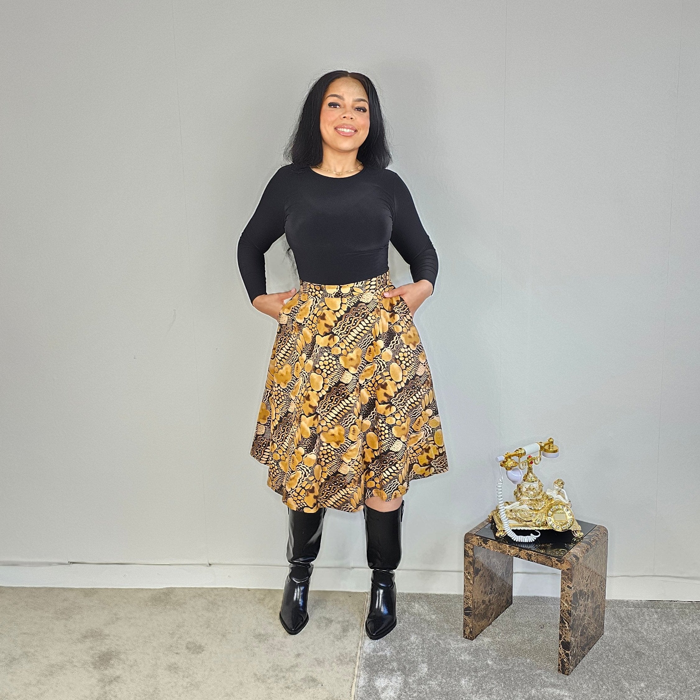 Introducing our Black & Gold Flare Skirt, made with 100% cotton and featuring pockets, a zip fastening, and a flattering flare cut. This Ankara skirt is perfect for any occasion and will add a touch of elegance to your wardrobe. Elevate your style today!
