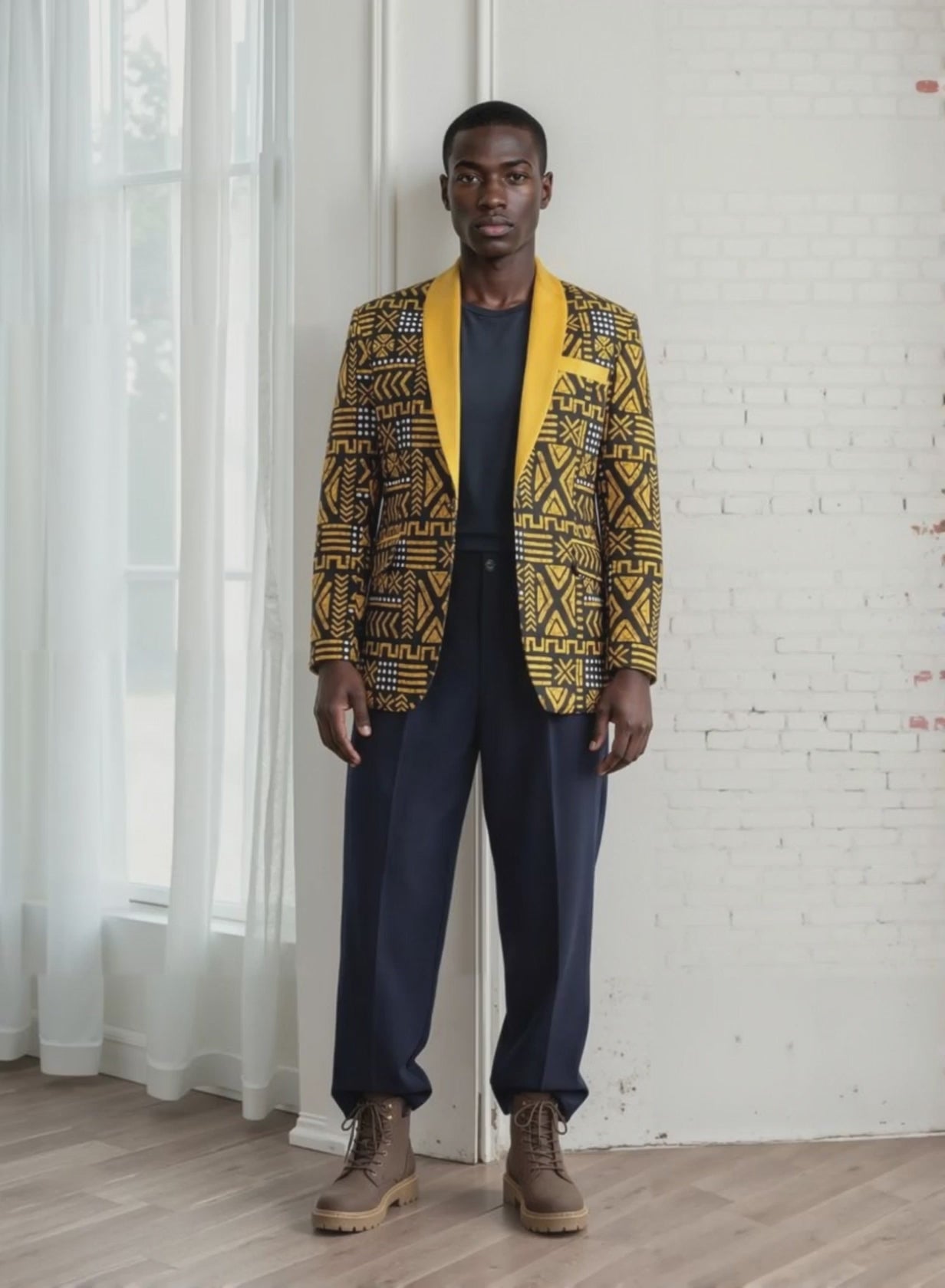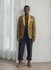 Indulge in the luxurious style of our Black & Gold Tribal Print Men's Blazer. Made with 100% cotton Ankara fabric and featuring a single button, breast pocket, long sleeves, and full lining, this blazer is both stylish and sophisticated. Perfect for any occasion, elevate your wardrobe with this exclusive piece.