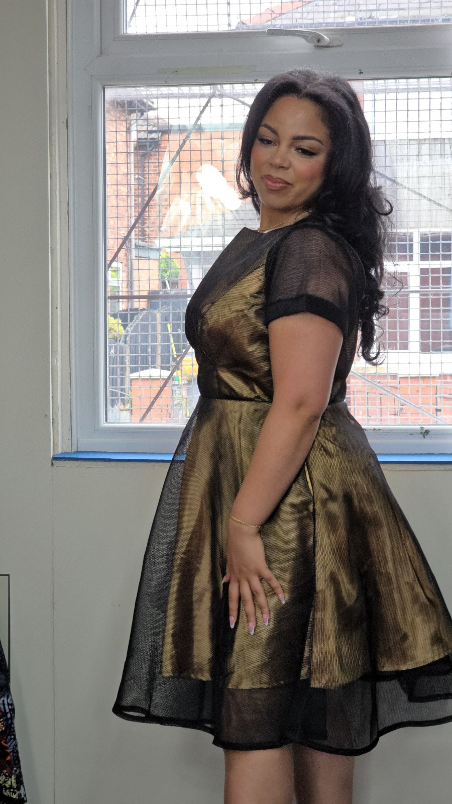 Indulge in luxury with our Black Mesh Flare Dress. Crafted with elegance in mind, this dress is made from black cotton mesh and fully lined with contrasting gold satin fabric. The short sleeves add a touch of sophistication and the convenient pockets make it both stylish and practical. With a zip fastening, this dress is a must-have for any upscale event.