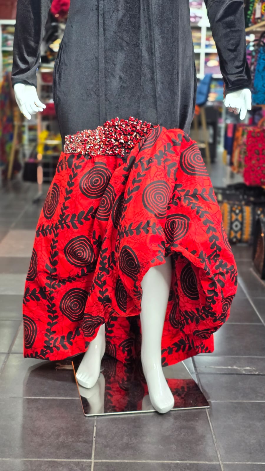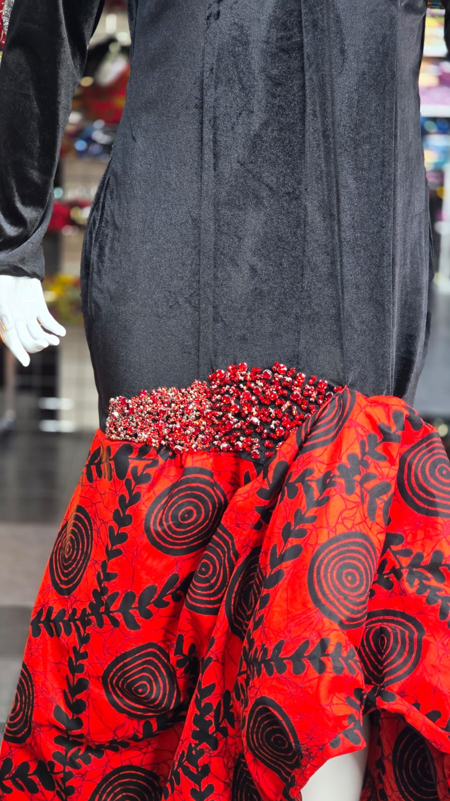 Step out in style with our Black & Red Dress, designed to make heads turn. Made from a luxurious blend of black velvet and 100% Ankara cotton, this elegant dress is perfect for any occasion - from birthdays to evening events. Pair it with red or black heels for a truly stunning look.