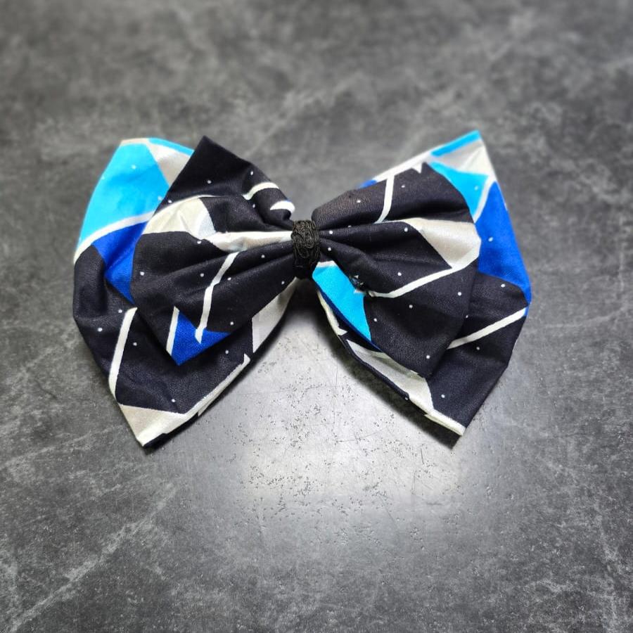 Add a playful pop to your hair with this handmade hair clip featuring a vibrant Blue & Black 100% cotton African print fabric bow, fastened together with matching colour ribbon. Includes a silver clip for easy styling. (Hair game strong!)