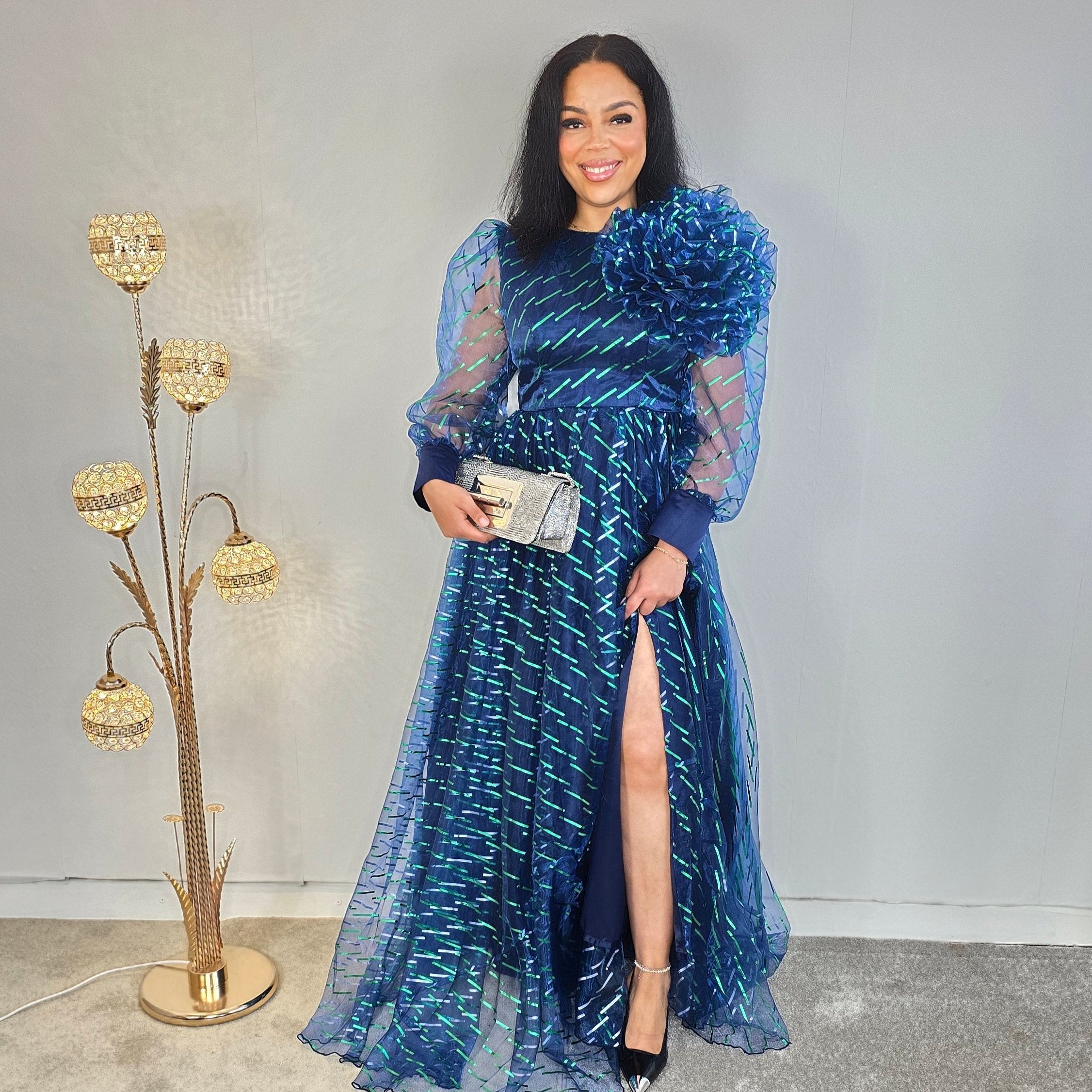 Exude elegance in this long, fully lined Blue & Silver Organza Dress. Featuring an oversized rose on the shoulder, puff sleeves, and a front slit, this dress is sure to make a statement at any occasion. With a convenient zip fastening, it's the perfect choice for special events.