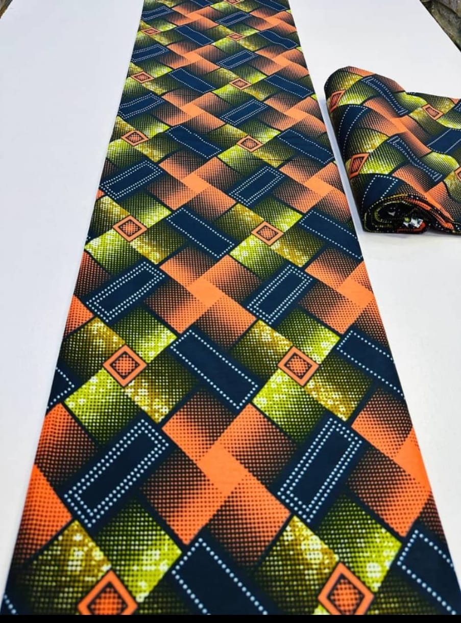 Add some colourful charm to your wardrobe with this 100% cotton machine washable African Print fabric. This green & orange African Print with its rectangular array is sure to turn heads and add a touch of attractiveness to any outfit or project. Perfect for anyone looking to stand out in style!