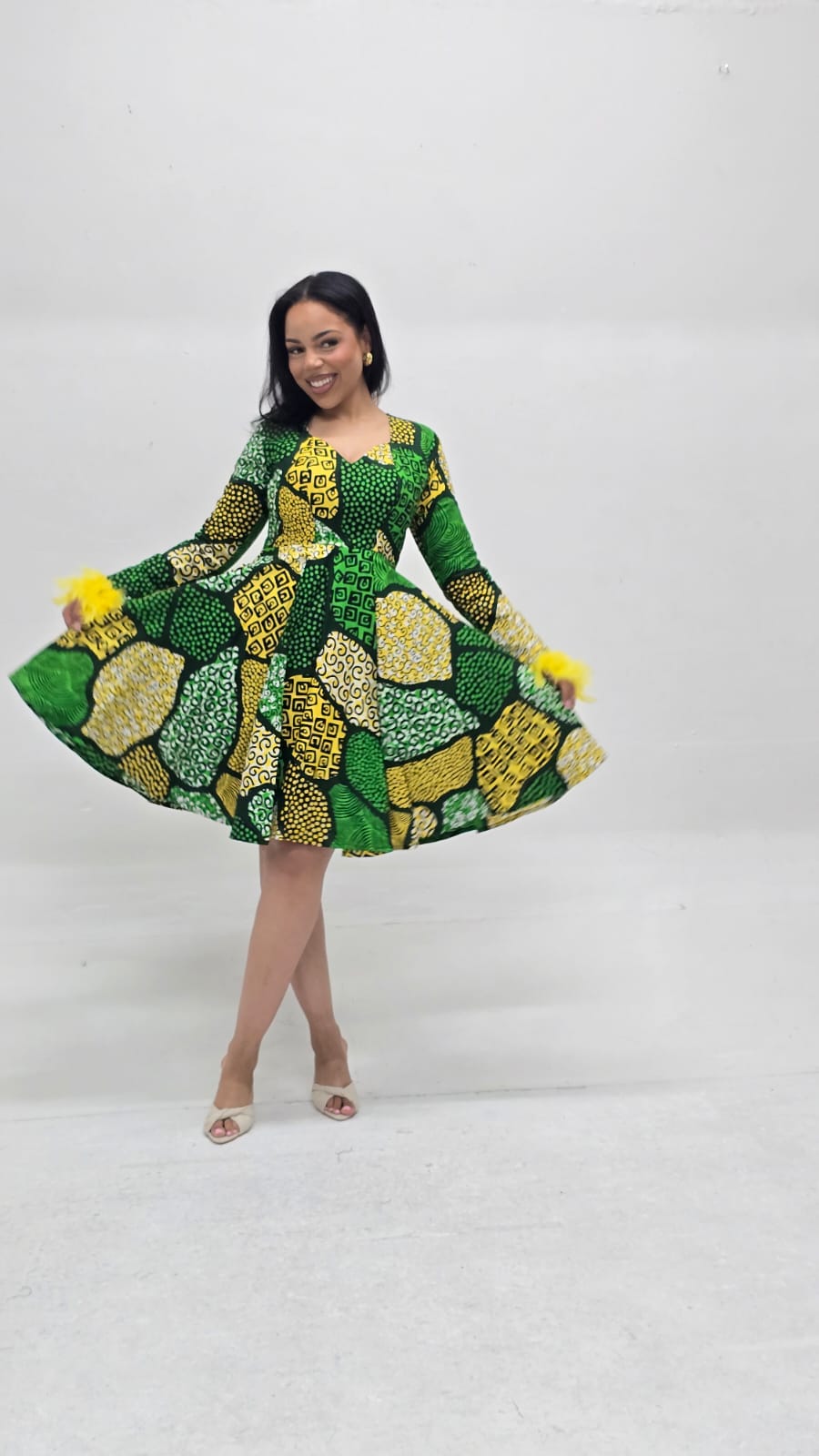 Elevate your wardrobe with the Green & Yellow Chloe dress. This stunning piece features a vibrant electric green and yellow colour palette, accented with faux feather trimmings on the sleeves. The demure long sleeves and pocket add practicality to this semi-casual dress, making it a versatile and sophisticated choice for any occasion.