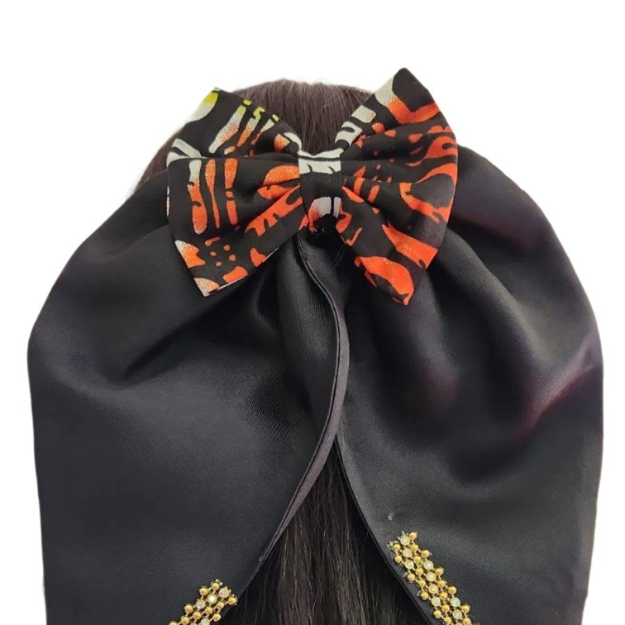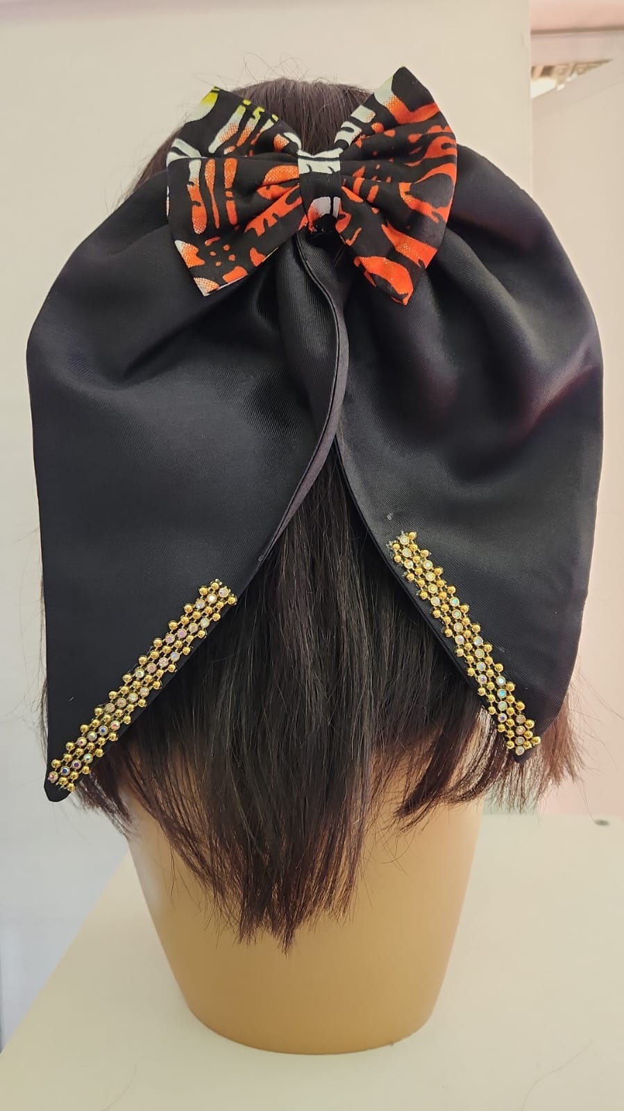Add a touch of elegance to your hair with our Large Black and Red Hair Clip. The large black tail bow, made of Mikado fabric, is complemented by a small yellow 100% cotton African Print fabric bow. The gold diamante detail adds a sophisticated touch, while the silver clasps ensure a secure and stylish hold. Elevate any outfit with this exclusive accessory.