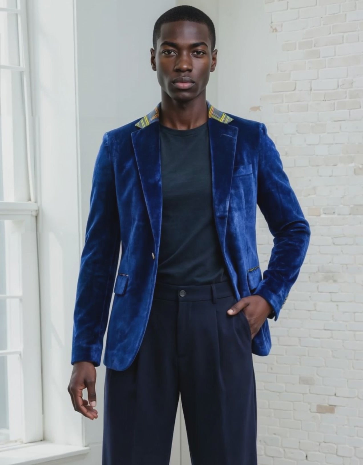 This luxurious blue suede blazer exudes masculinity and gentlemanliness. Its simple yet elegant design is elevated by African Print patches, adding a touch of exclusivity to the piece. Perfect for the sophisticated gentleman looking to make a statement. Pair with shirt, bow tie, suit pants and leather shoes to create a gentle manly look and a sense of mystery.
