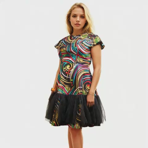 Get ready to show off your playful side with our Multicolour Ankara Dress! With semi flare design, mesh net frills, and 100% cotton African Print fabric, this dress is perfect for any cocktail occasion. And don't forget about the pockets and full lining for added convenience and comfort. Look trendy and feel comfortable with our Ankara Dress!