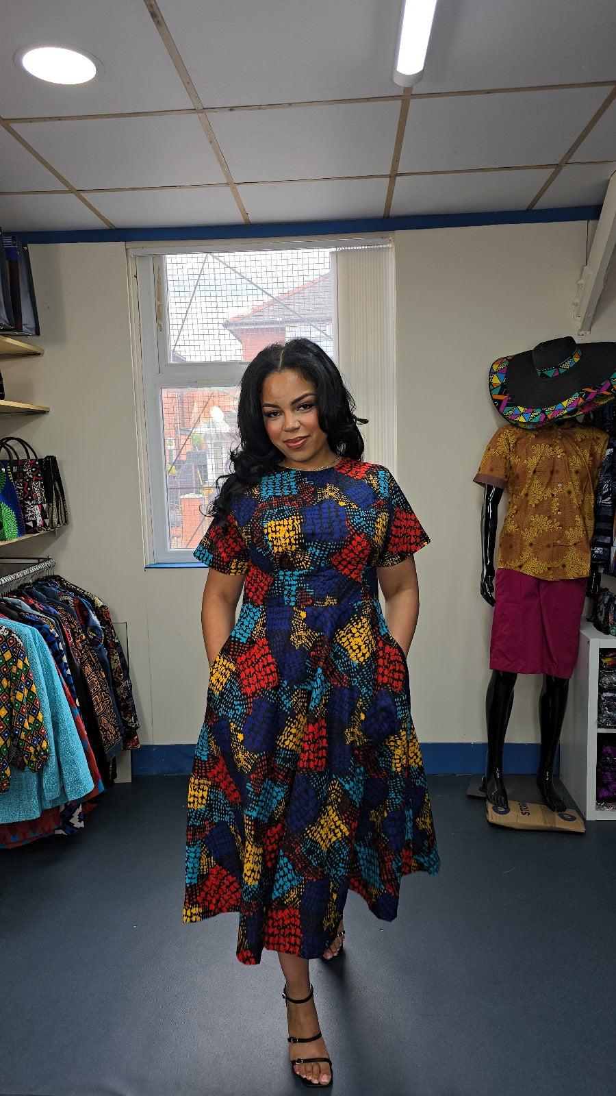 Get ready to turn heads in this Multicolour Flare Ankara Dress, Made from 100% cotton Ankara Fabric. This dress is lightly padded around the burst for a rounded look. With its three-quarter length, flare silhouette and vibrant colours, this dress is perfect for any occasion - whether it's a church service, lunch date, or party. Fully lined and featuring a zip fastening and pockets on both sides, you'll be both fashionable and functional. Style it up with heels or trainers for a fun and elegant look.