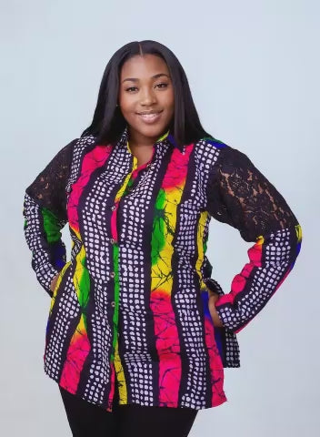 Elevate your style game with our Multicolour Long Sleeve Ladies Shirt. This shirt is made with 100% cotton Ankara Fabric, featuring a unique button fastening and sleeves accented with black cord lace. With side vents on both sides and gold and black buttons, this shirt is perfect for a semi-casual look. For the ultimate outfit, pair it with our pink Mikado trousers.