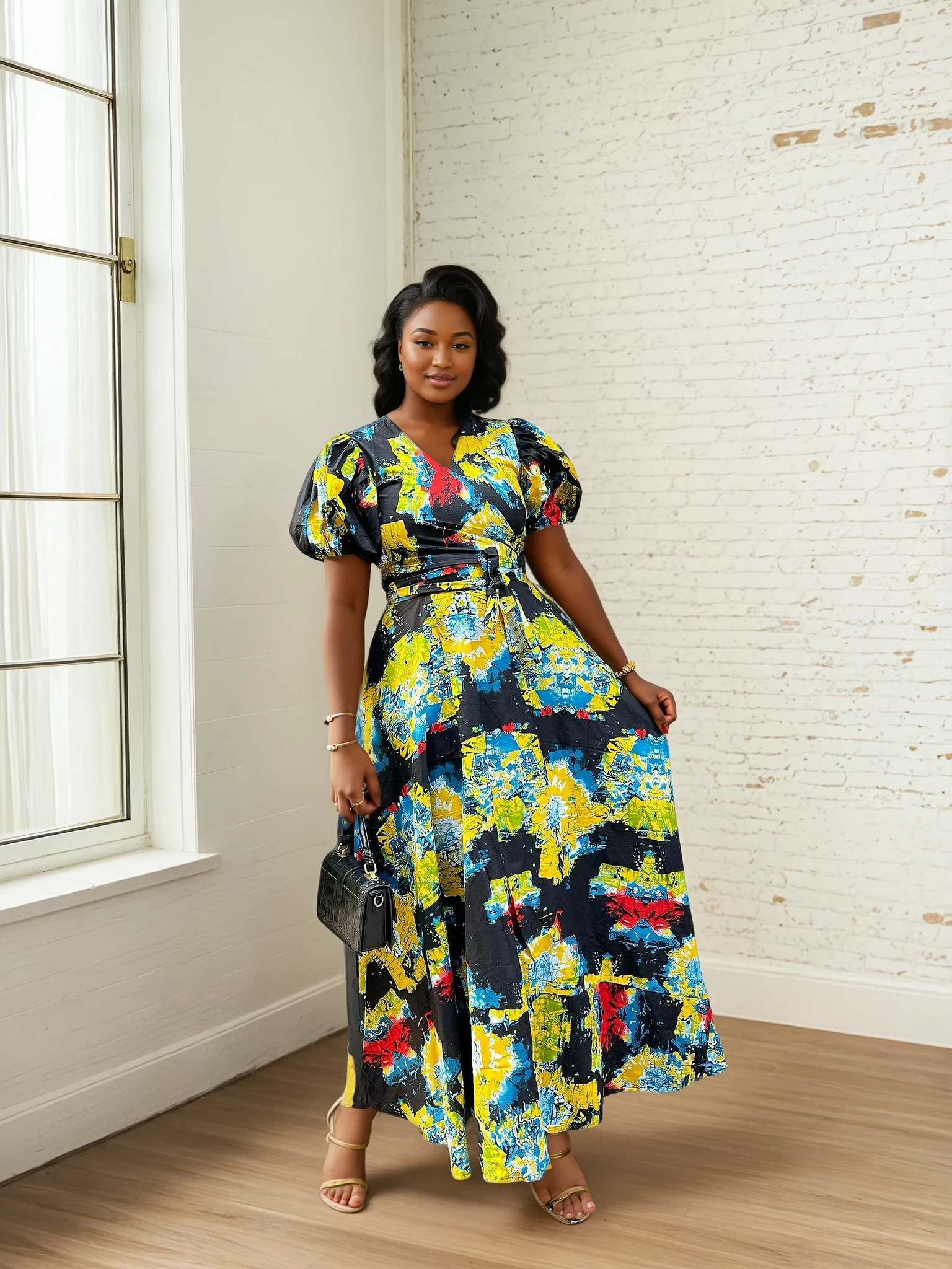 Discover effortless elegance with our Black & Multi Mock Wrap Dress. Crafted from 100% cotton African print, this dress boasts a wrap top and flattering flare, creating a silhouette that will turn heads. With convenient pockets and a versatile design, it's perfect for any occasion, from weddings to parties and more. Upgrade your wardrobe with this sophisticated and exclusive piece.