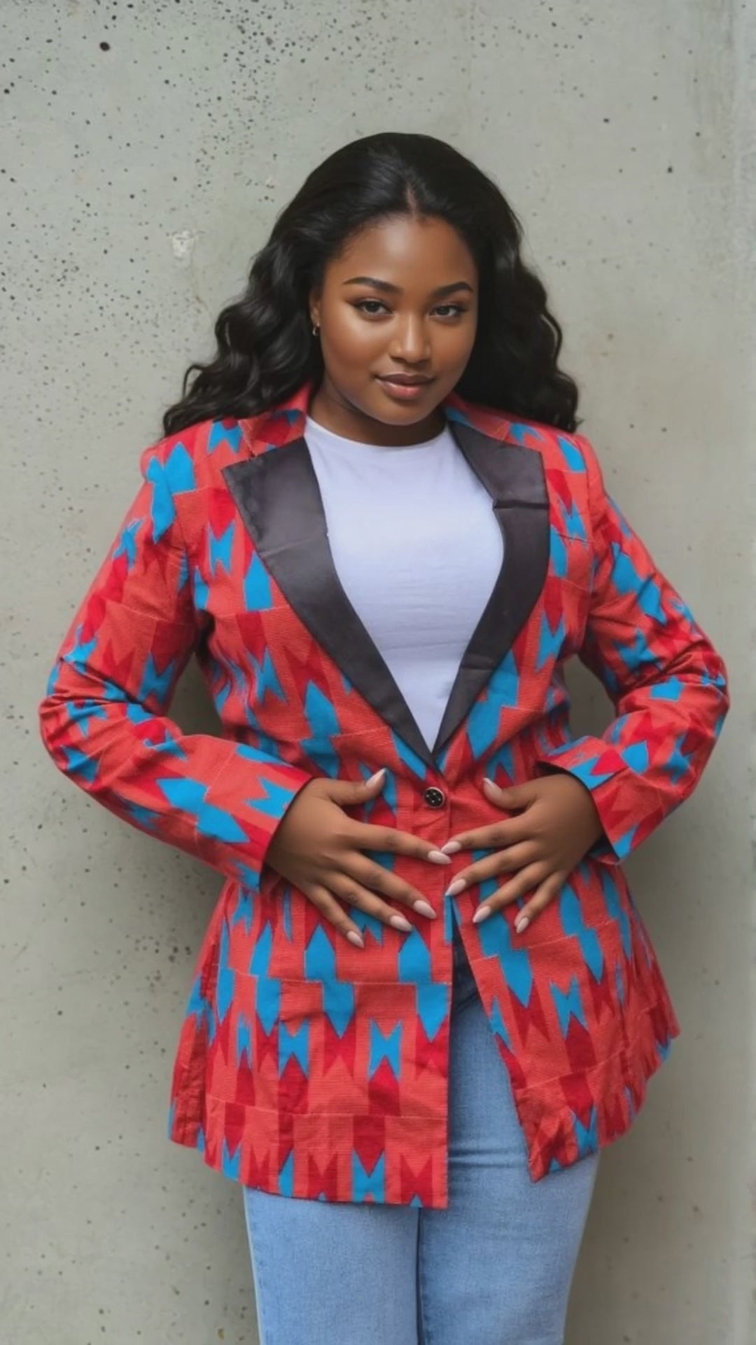 Introducing our Red & Blue Ankara Blazer. Crafted from high-quality 100% cotton, this fully lined blazer features striking black lapels for a timeless and sophisticated look. Perfect for any occasion, the outside pockets add convenience, while its versatile design allows for both casual and formal styling. Elevate your wardrobe with this statement piece.