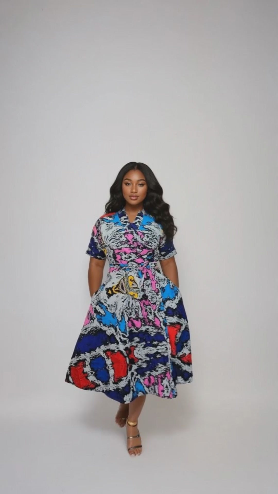 Elevate your wardrobe with our White & Multicolour Wrap Dress. Crafted from luxurious 100% cotton ankara fabric, this power lady look exudes confidence. With a fit flare design and pockets for convenience, you'll dominate every room you enter. Make a statement and stand out with this elegant and exclusive dress. Mode is caring our leather bag available online.